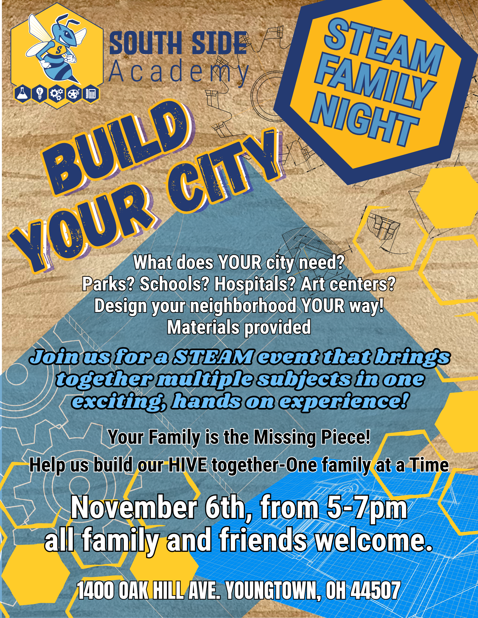 Help us build our HIVE together-One family at a time on November 6th, from 5-7pm. What does your city need? Parks? Schools? Hospitals? Art centers? Design your neighborhood YOUR way! Materials provided Join us for a STEAM event that brings together multiple subjects in one exciting, hands on experience! Your Family is the Missing Piece!